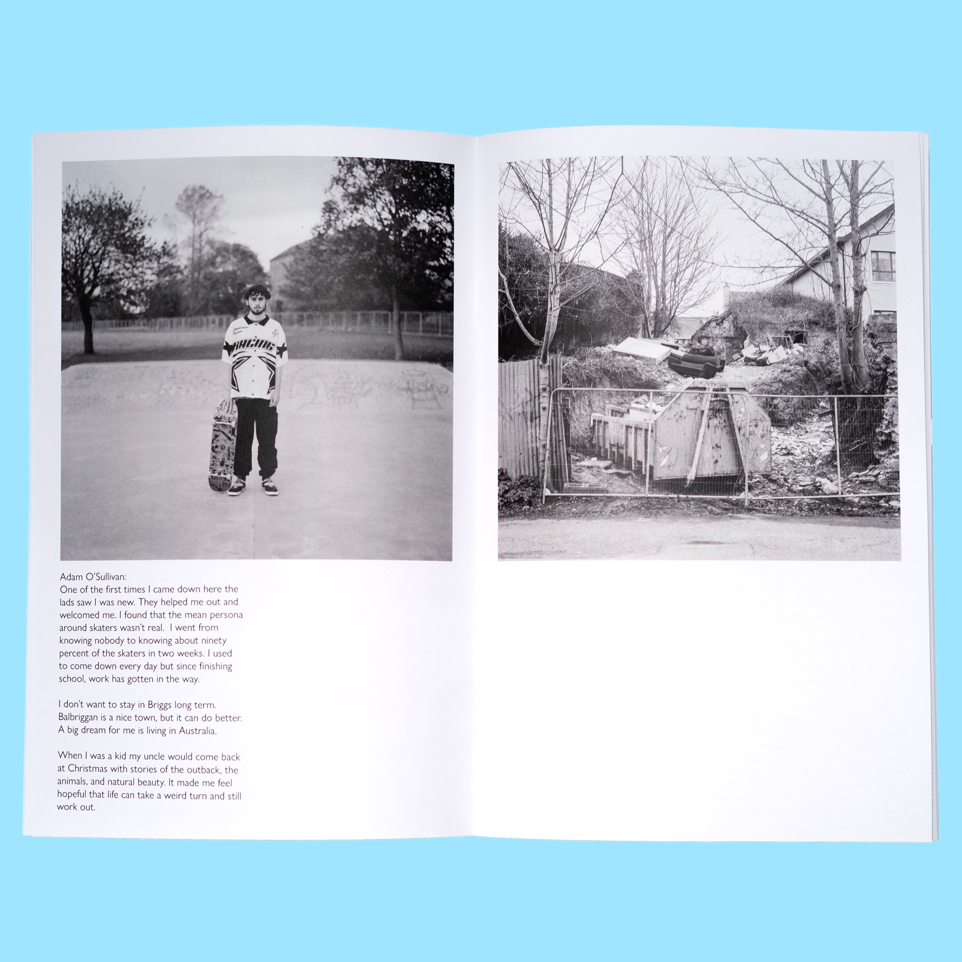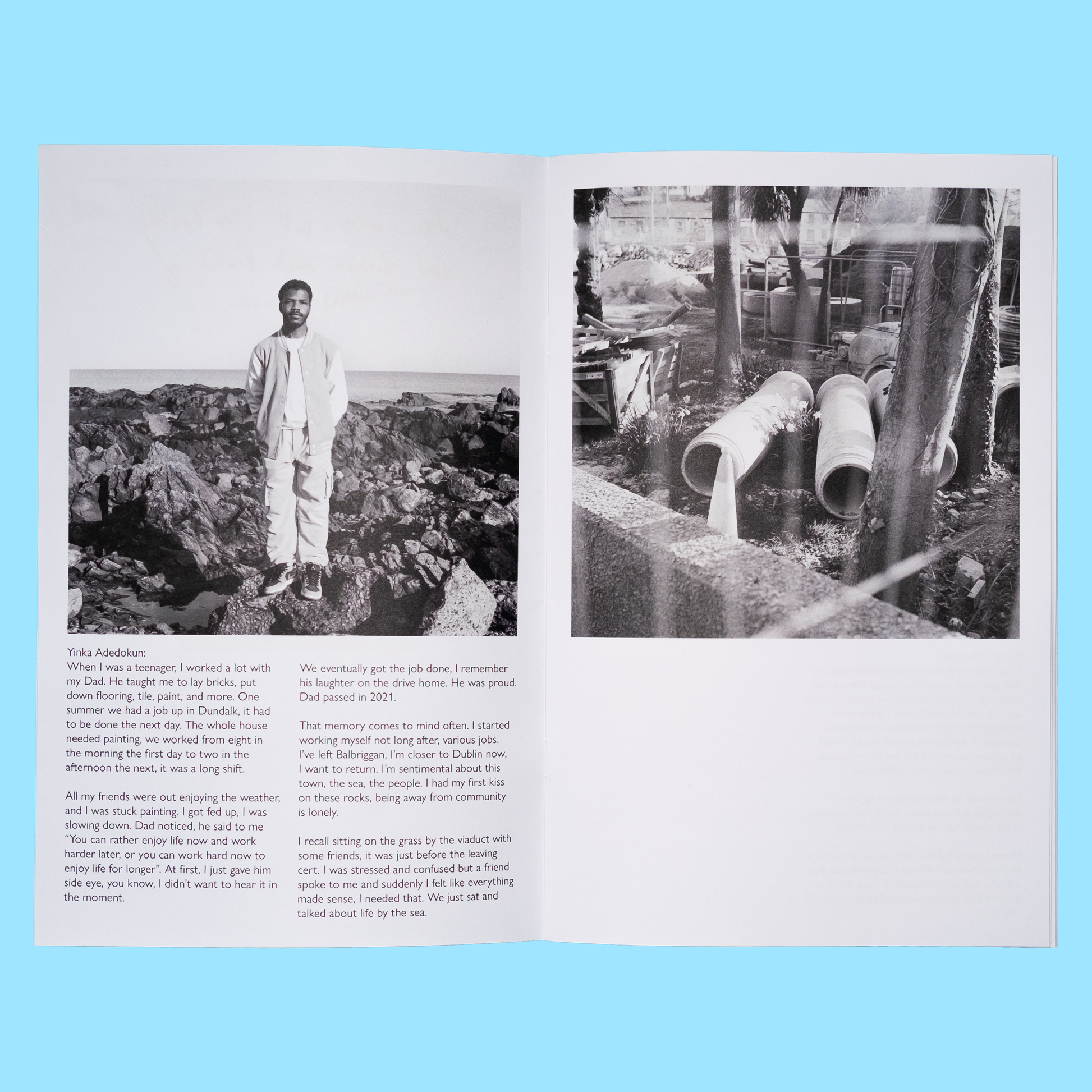 We are all the rocks and ruins and tides of this place is a photographic exploration of Balbriggan, a seaside town in north county Dublin shaped by memory, dereliction and rapid change. Once a site of ruins from the War of Independence, it is now one of Ireland’s fastest growing towns. This photo-zine includes 14 images with portraits and first person prose texts created through semi structured interviews, reflecting on personal histories and connections to place.